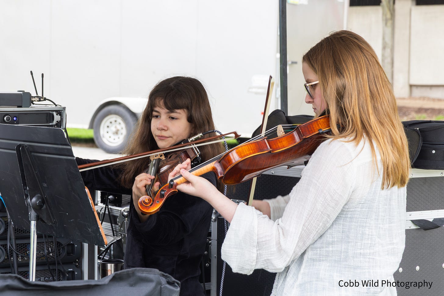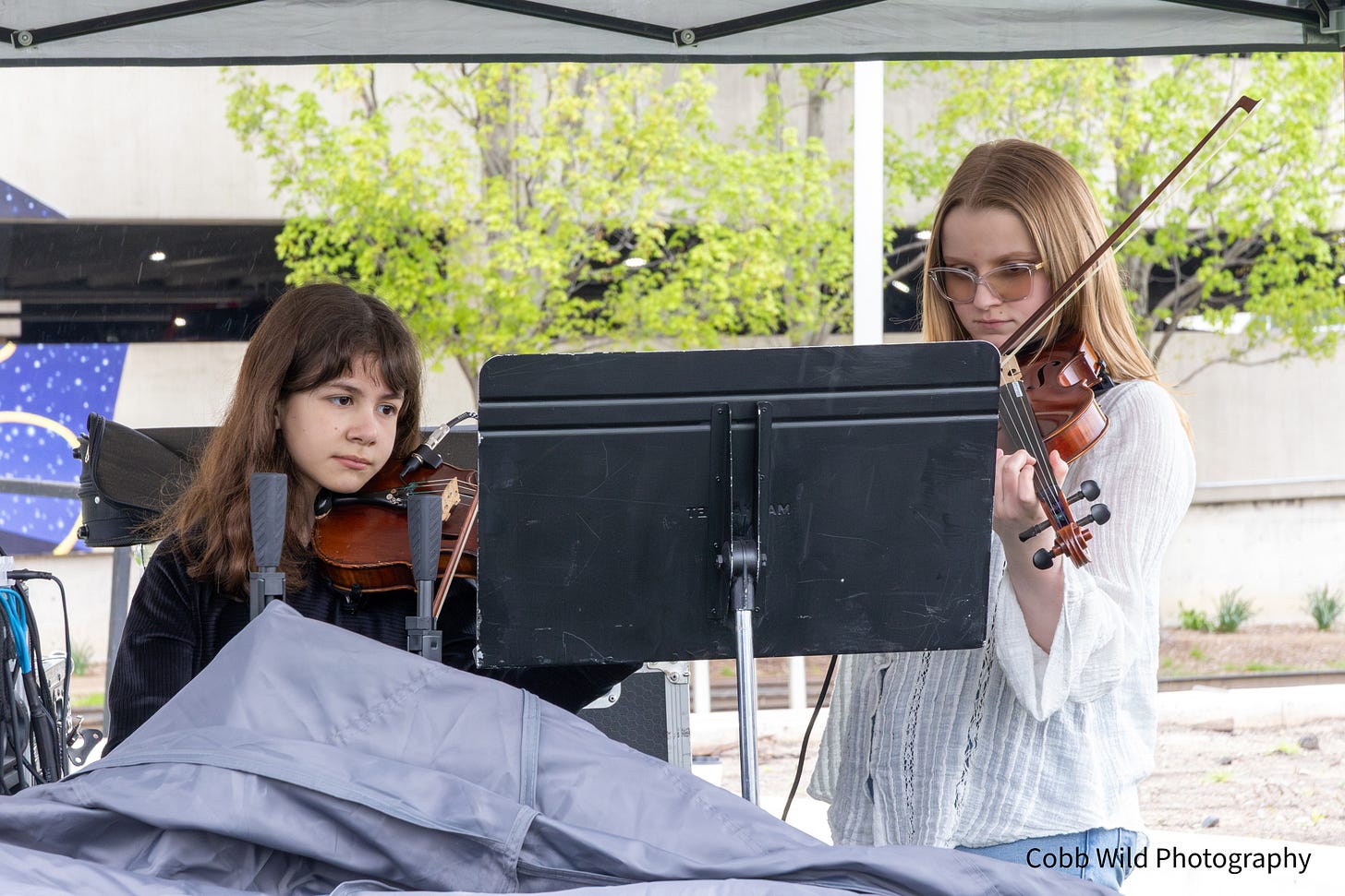 Janset Celik (left) and Mira Gibbons (right) play their violins during the Freedom Feastival on Friday May 2nd. Celik has been playing the violin for nine years while Gibbons has been playing for ten years.