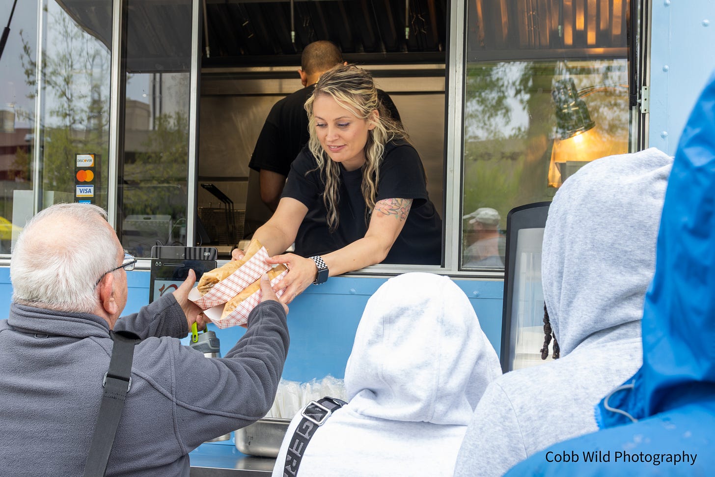 Christina Stevens from Pita’s Mediterranean and American Cuisine hands food to a customer during the Freedom Feastival on Friday. Pita’s Mediterranean and American Cuisine has a physical location in Hiawatha and has had the food truck since last year.