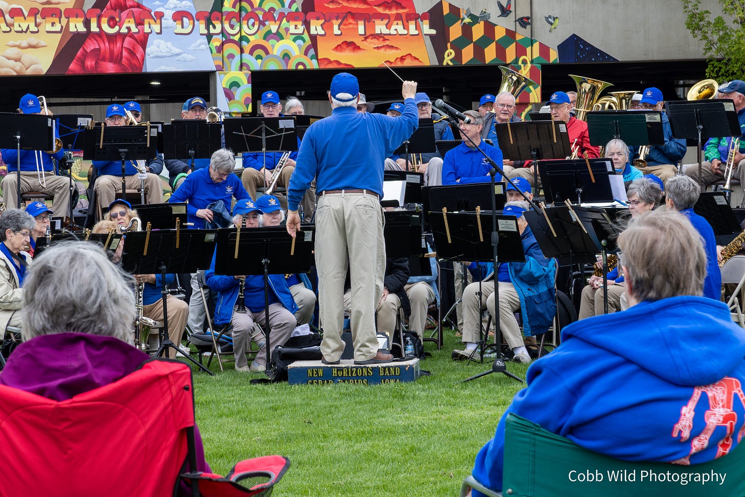Conductor Alan Lawrence (center) leads the New Horizons Band during the Freedom Feastival celebration held on Friday May 2nd at Green Square Park in Cedar Rapids. Alan Started the band, which is exclusively for people ages fifty five and up, in 1999. The band rehearses every Tuesday morning for two hours.