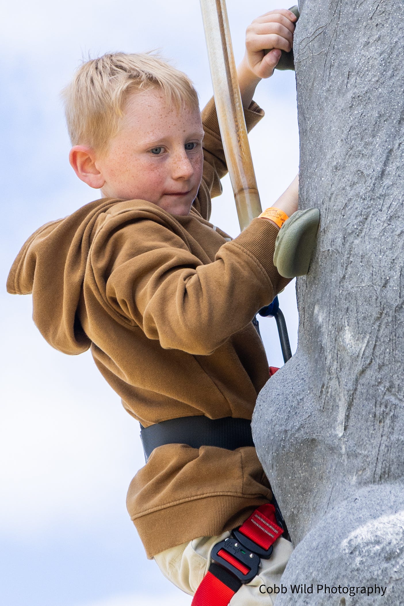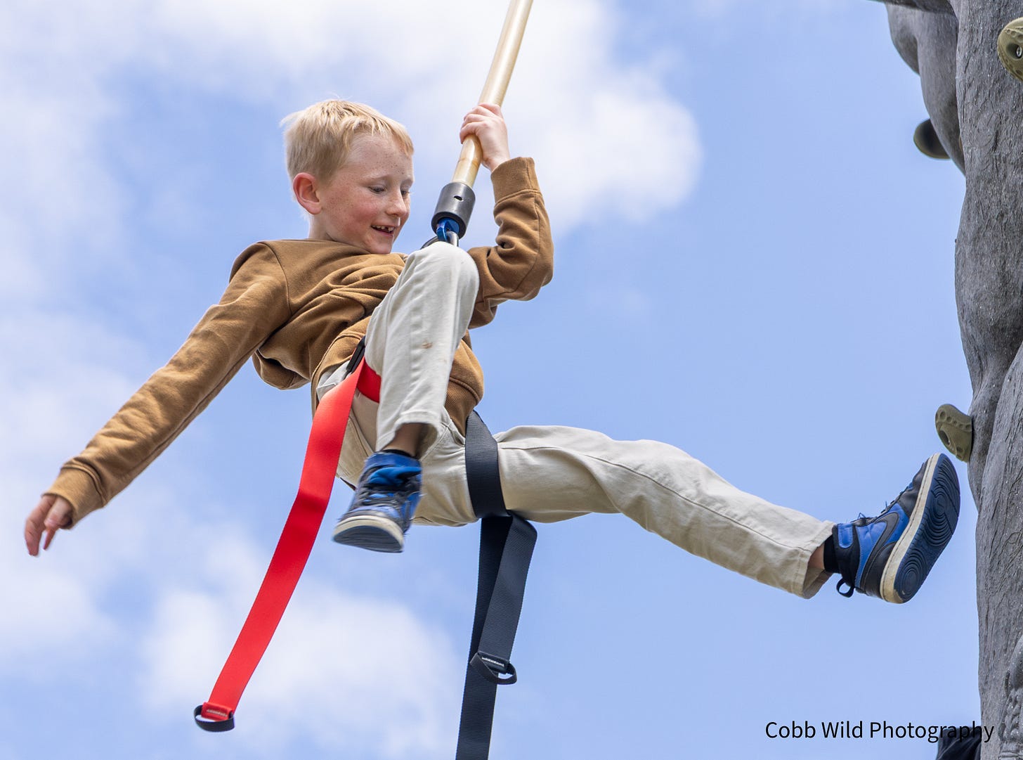 Karter Green Climbs the rock wall provided by H&H Fun Rides and then repels down it while enjoying the Houby Days festival with his dad.