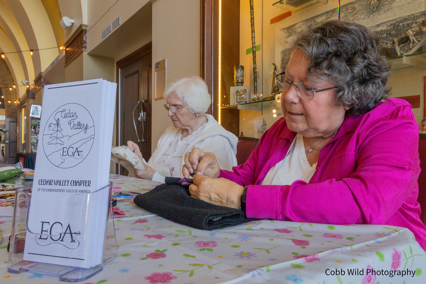 Members of the Cedar Valley Chapter of the Embroiderers Guild of America Sharon Kolosik (left) and Martha Quint Lawrence show off their skill at their station in the National Czech-Slovak Museum in Cedar Rapids. The Cedar Valley chapter of the Embroiderers Guild of America has 103 members.