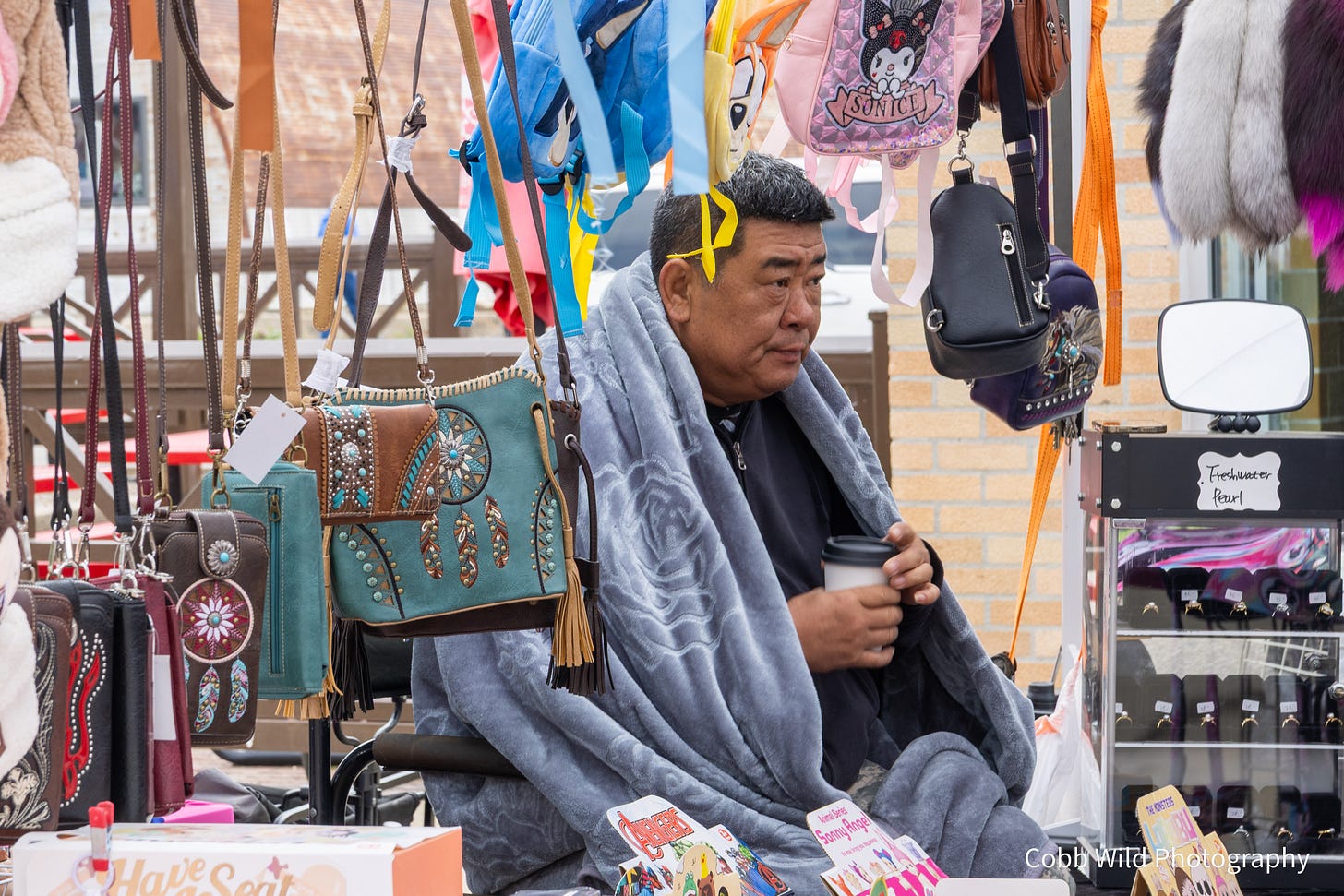 (above picture) Vendor Hongwei Lee watches his shop while attempting to sell goods during the Houby Days Festival. Lee is from St. Louis and travels the country selling hats, necklaces, toy swords, purses, and more. Next week they will be in Mason City.