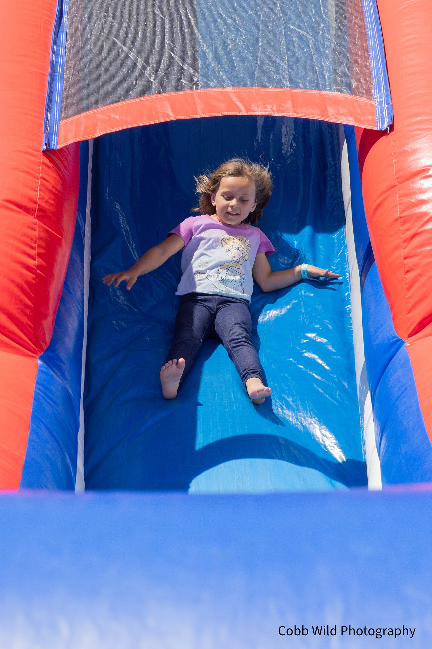 Oaklee Bouzek goes down the inflatable slide at the Houby Days Festival on Sunday the 18th.