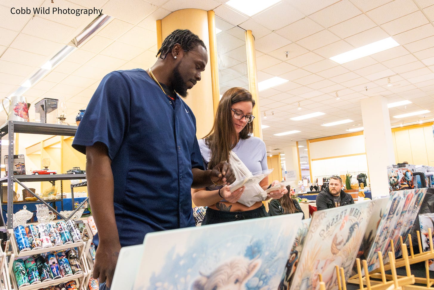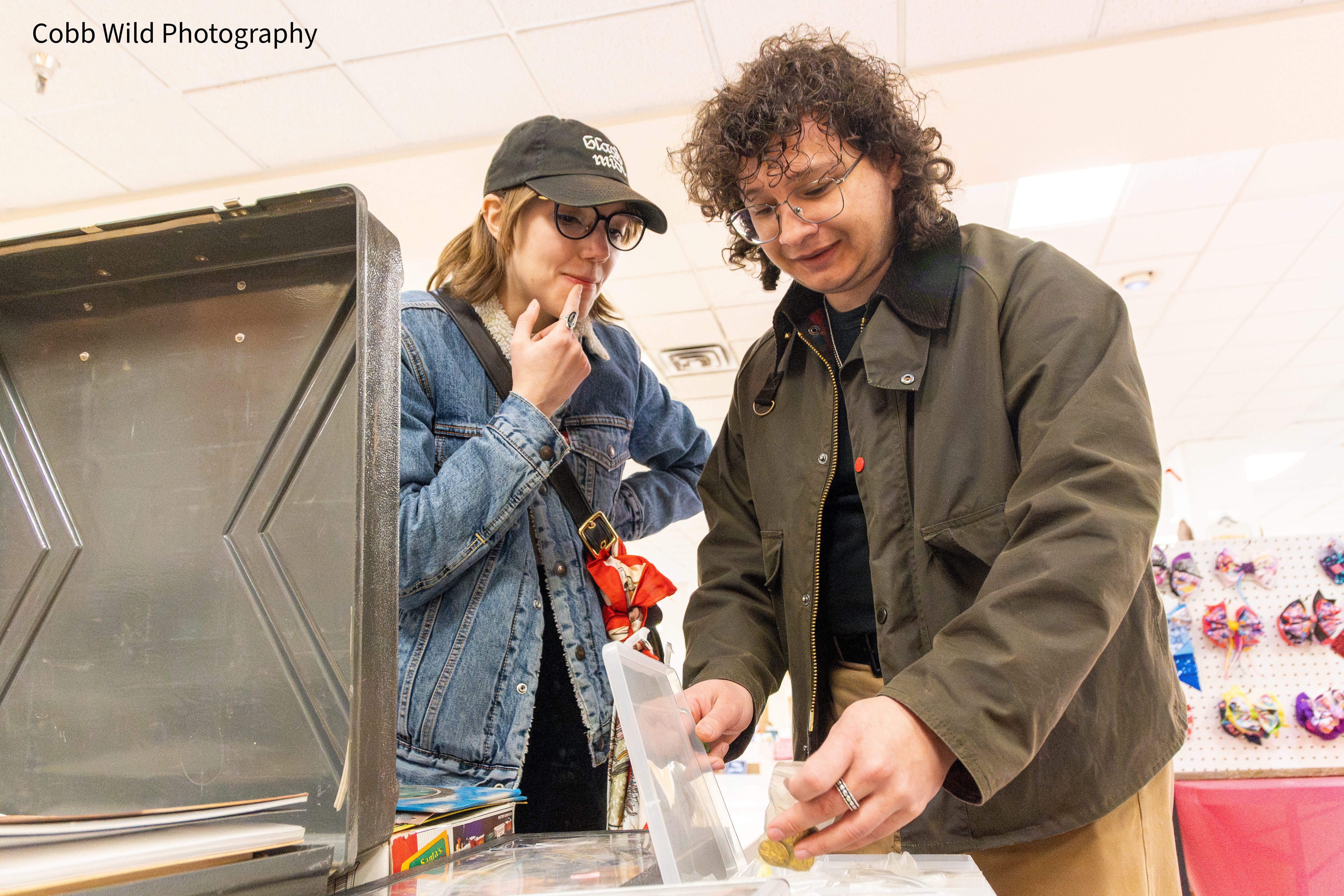 Callie Gardemann (left) and Norman Humble take a look at some of the items available for sale at the Vendors for Flea Flea Markets table while attending the Wolf Den Flea Market in the old Yonkers store at Lindale Mall on Sunday March 29th. Vendors for Flea Markets is owned by Neil and Mariah Lahr who participate in six flea markets per year.