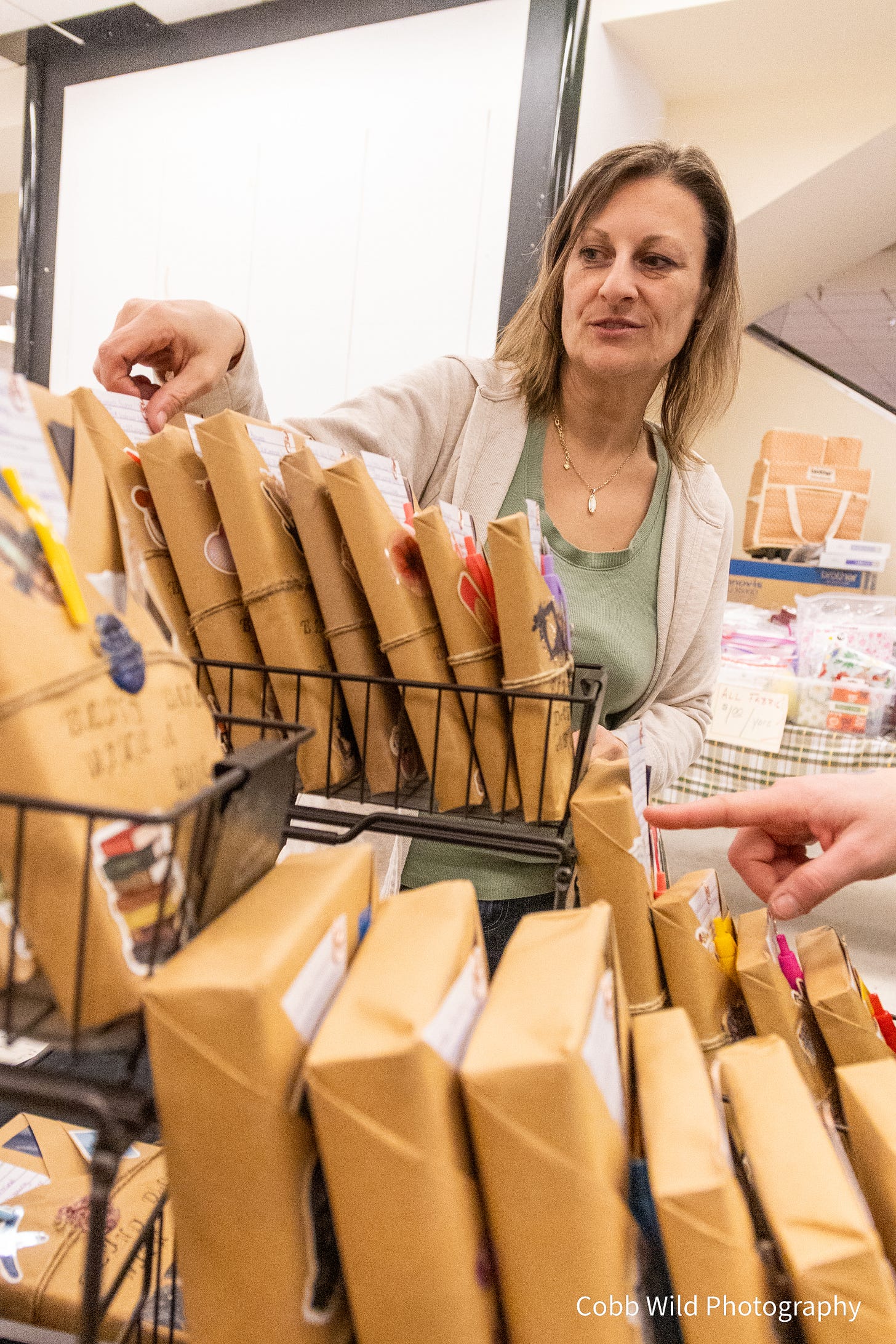 Corey Staten (left) and Bobbie Hoover from Cedar Rapids look at some of the cutting boards for sale by Loyal Impressions owner Alissa Klein while attending the Wolf Den Flea Market on Sunday March 29th. Klein has owned her business for the last six years, and made the cutting boards herself.