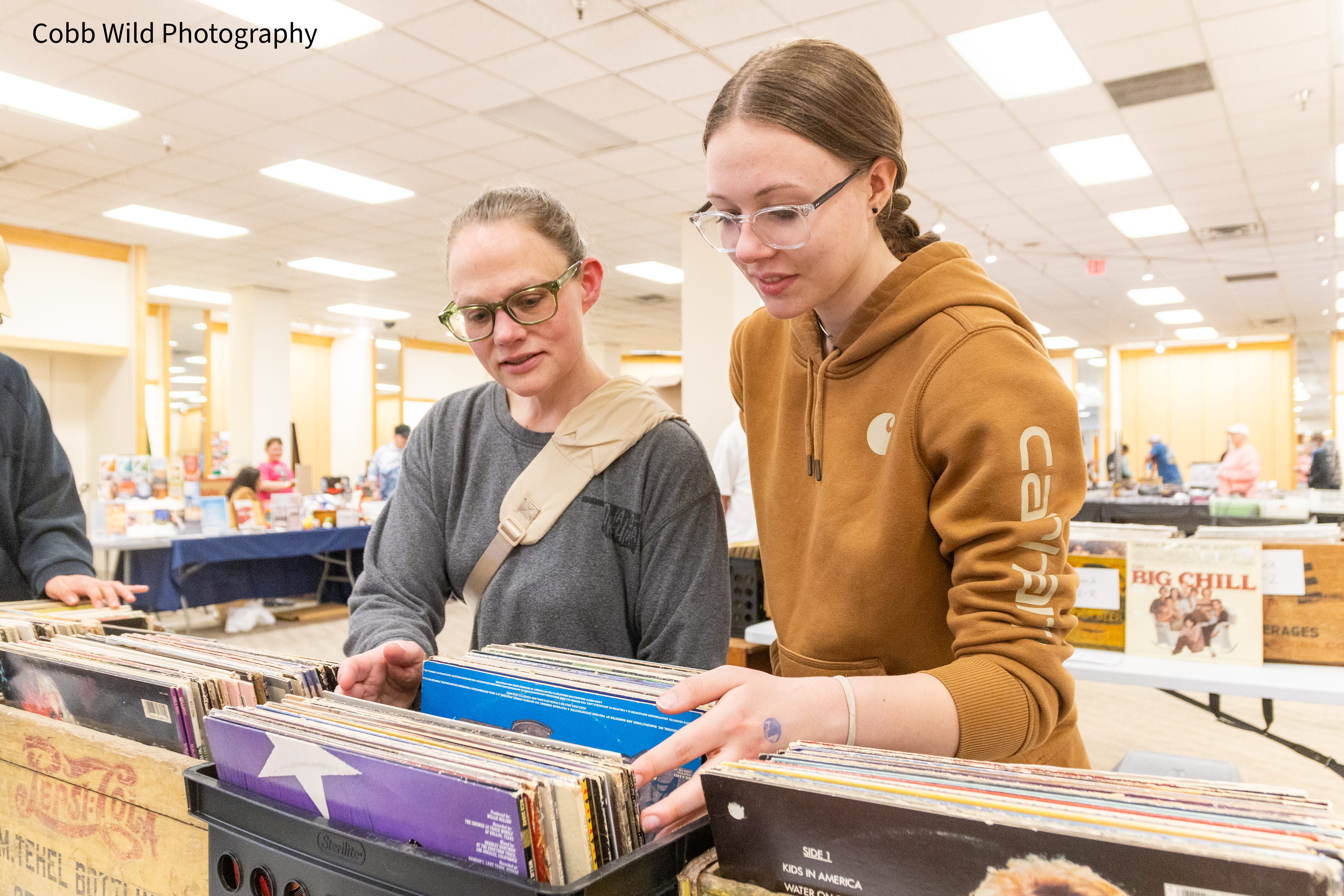 Nikki Loveless (left) from Cedar Rapids and Cloey Duran from the Quad Cities take a look at some of the records available for sale by Antiques/Candy Man owner Craig Bender while attending the Wolf Den Flea Market at Lindale Mall in Cedar Rapids on Sunday March 29th.