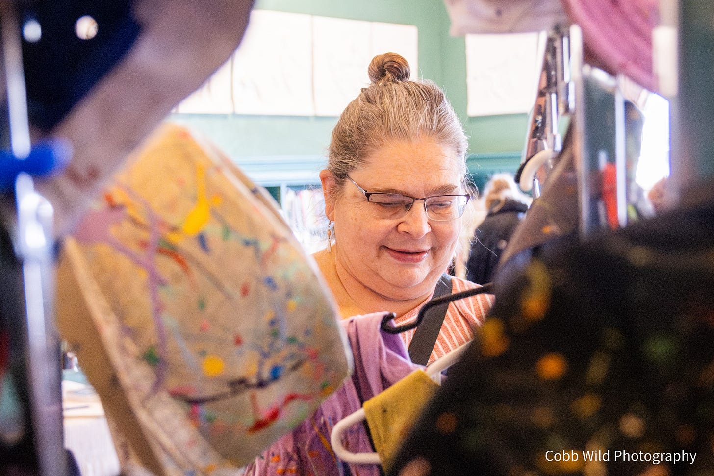 Jan Clarke stops to look at some of the painted clothing available for sale by Randy L. Estes (also known as Wizard). Estes has been in business for a little over two years, and has also created the Cedar Rapids Fashion Month with 237 Collective Creative Directors Abbey Long Williams and Paxton Williams as well as Deb Crerie of Kinheart Studio.