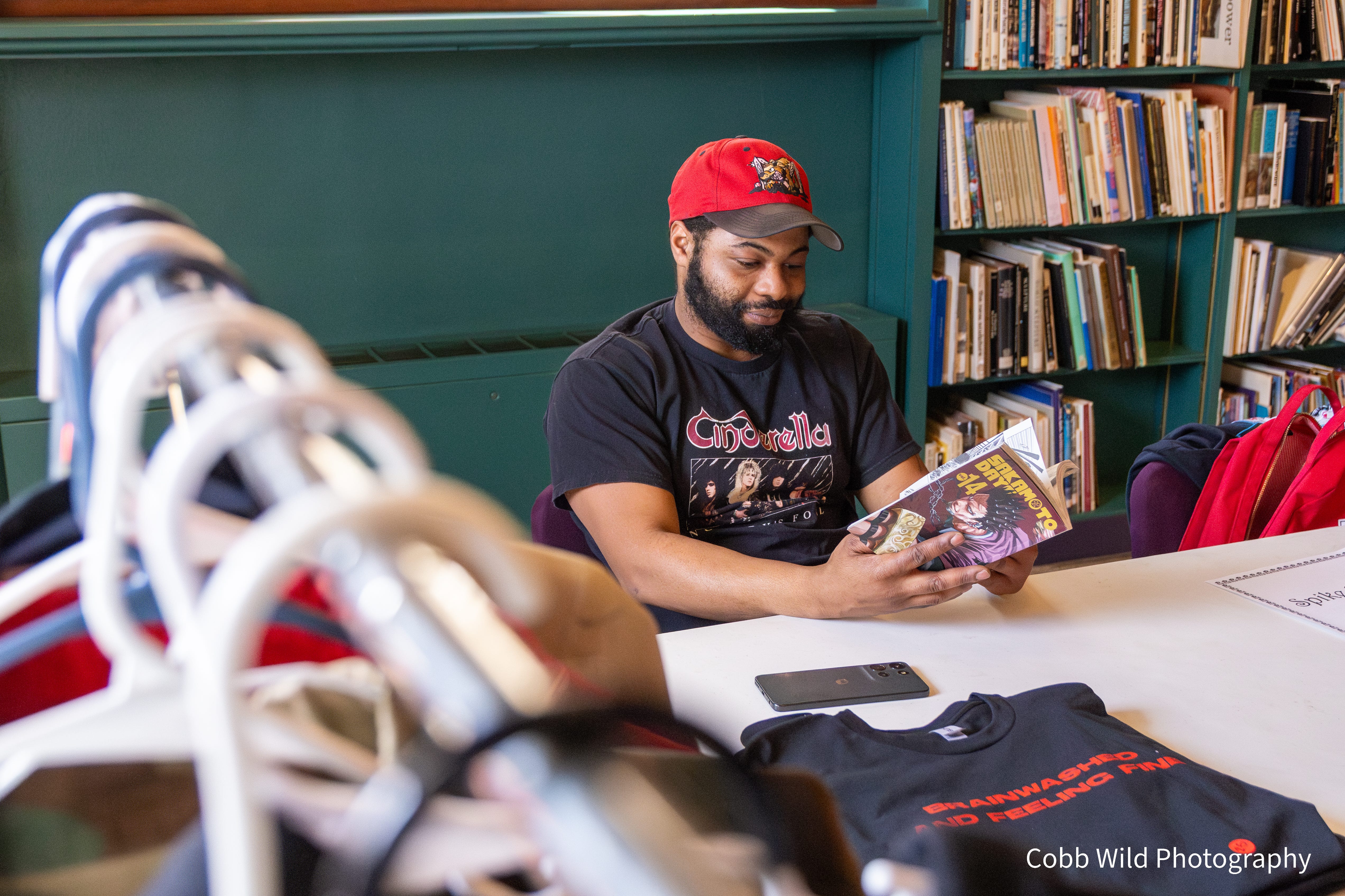 Spoke Dupree reads volume 14 of Sakamoto Days while waiting for potential customers to stop by his table. Dupree started his business with making jewelry before switching to making clothing in the last year. Dupree does shows in Cedar Rapids, Iowa City, and Des Moines.
