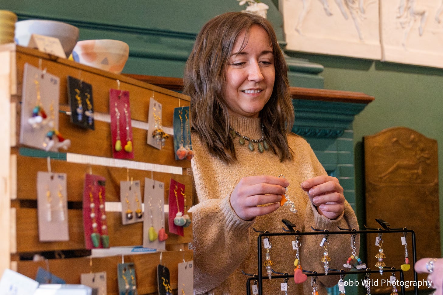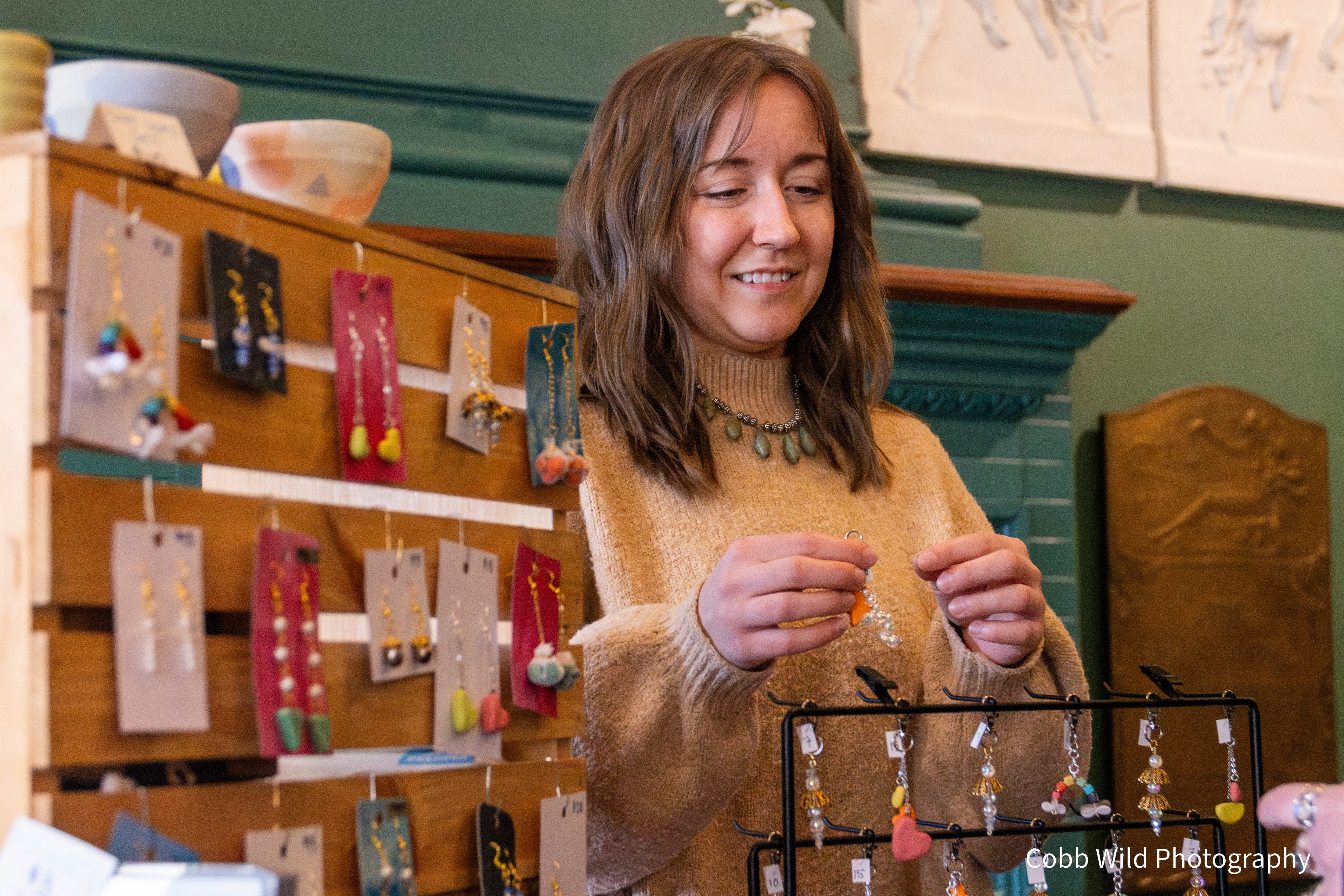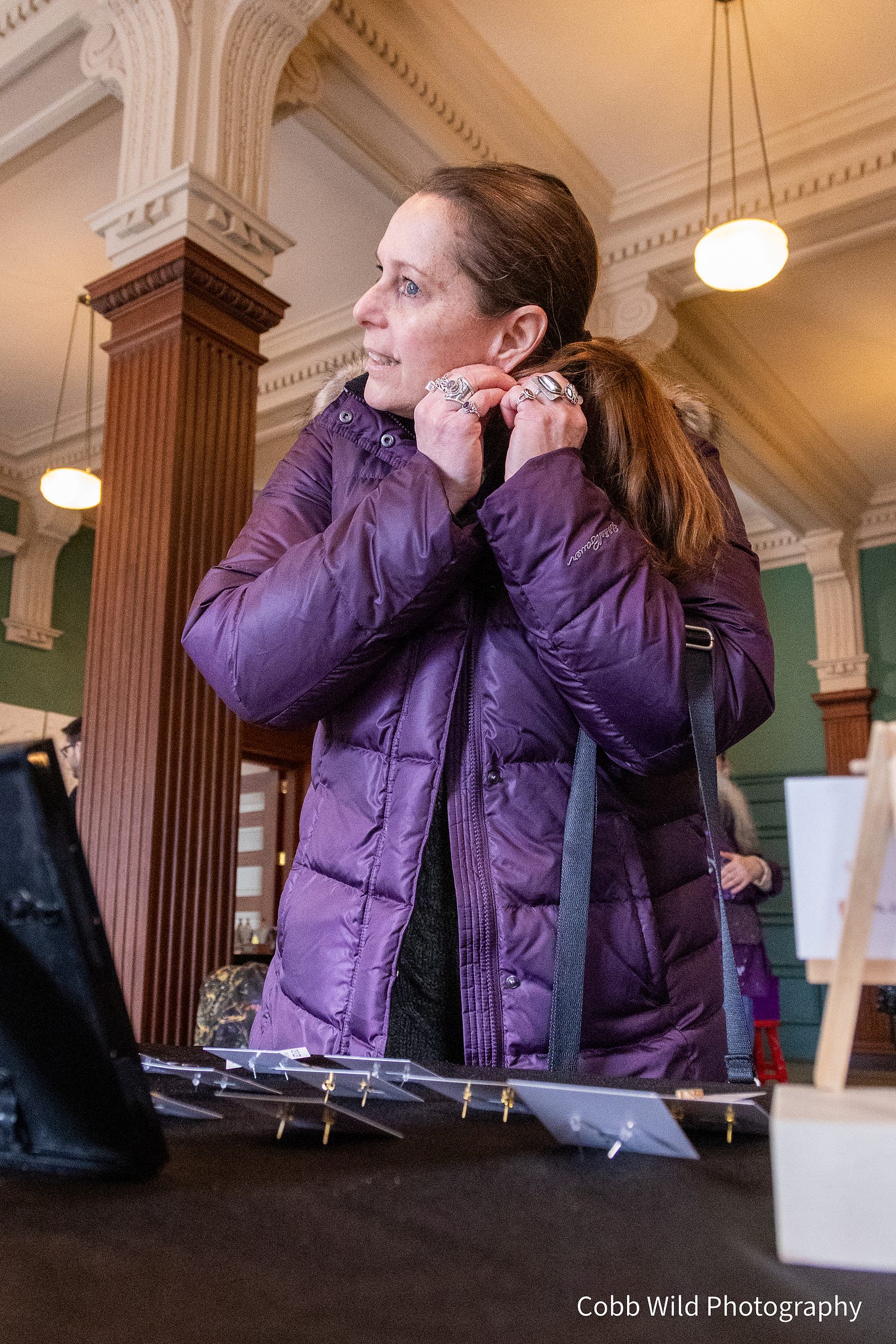 Sybil Scheetz puts on a new pair of earrings after purchasing them from Zoe Filzer during the Cedar Rapids Museum of Art’s Trunk Show. Filzer has been making ceramics for about four years, and jewelry for one year.